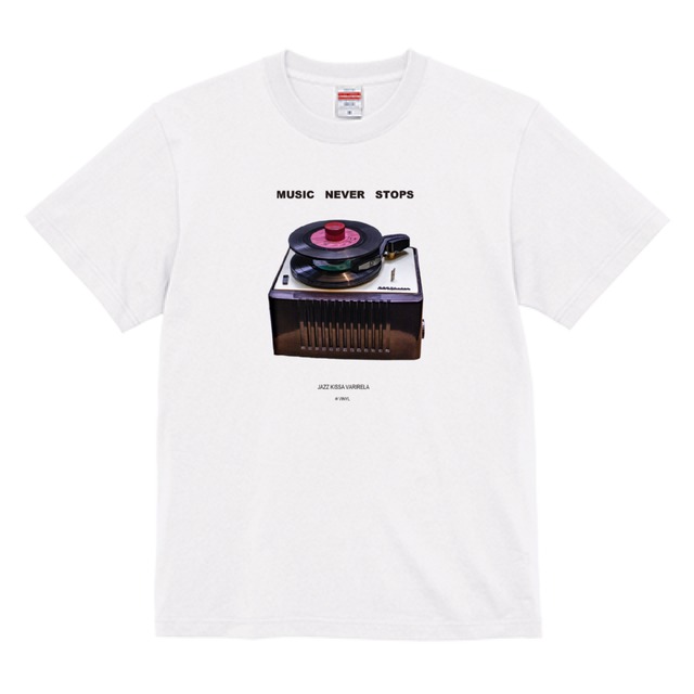 *ジャズ喫茶バリレラが所有するヴィンテージ・プレイヤーをTシャツ前面に転写。 デザインは、"JAZZ"の今を発信するトップ・エディター「ジャズ喫茶案内 https://jazz-kissa.jp」によるものです。 1950,60年代のアメリカのホームオーディオとして、一世風靡したヴィンテージ・プレイヤー、RCA45EY2。セットされたドーナッツ盤レコード約14枚が1枚終わるたびに、下に落ちて次のレコードがスタートするレコードチェンジャー。まさに、タイトルにある「 MUSIC NEVER STOPS」。 【仕様】(ユニセックス) M:69(丈)・52(幅)・168~175(身長) L: 73(丈)・55(幅)・175~180(身長) XL: 77(丈)・58(幅) ・175~180(身長) 素材:綿100% オンス:5.6oz